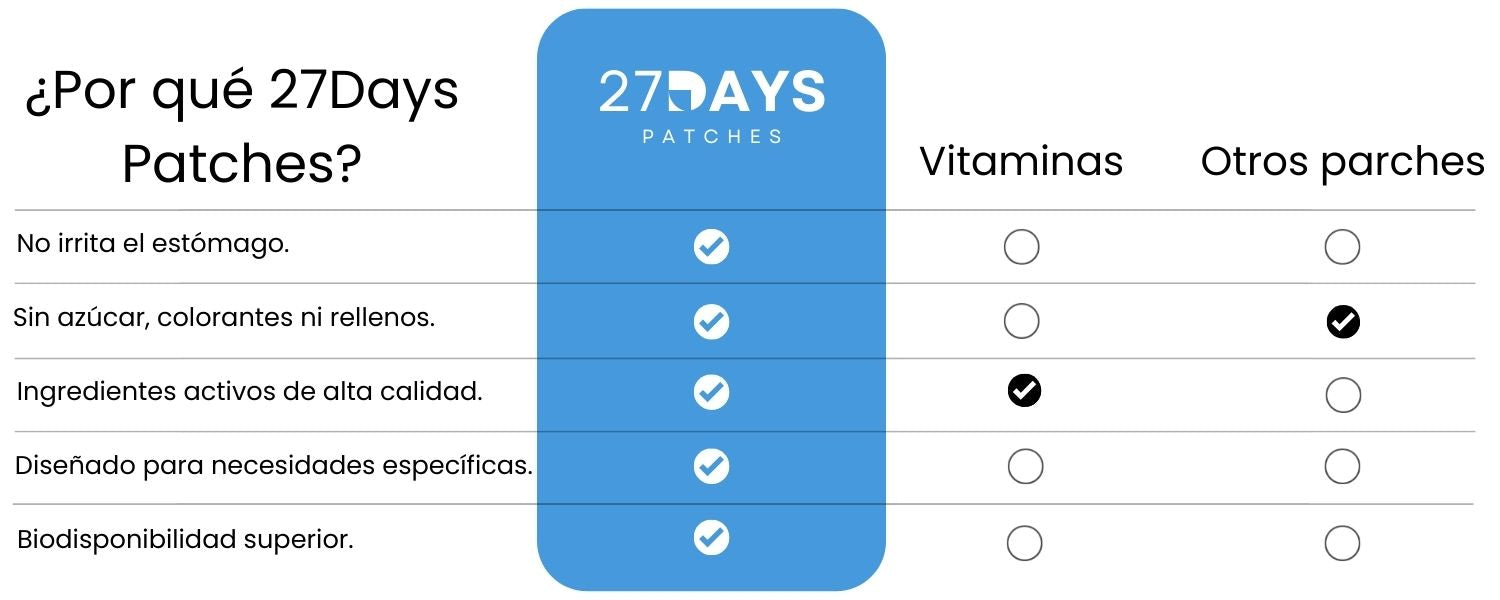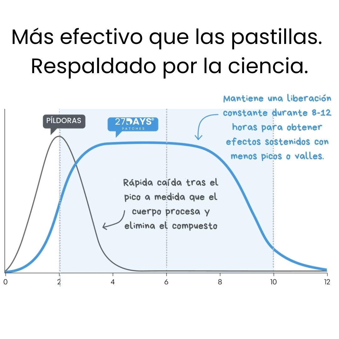 A diferencia de las pastillas, que provocan picos y bajones, 27Days Patches libera los ingredientes gradualmente durante 8-12 horas. Eso significa un apoyo más estable y sostenido, tanto si estás durmiendo, concentrándote o recuperándote.